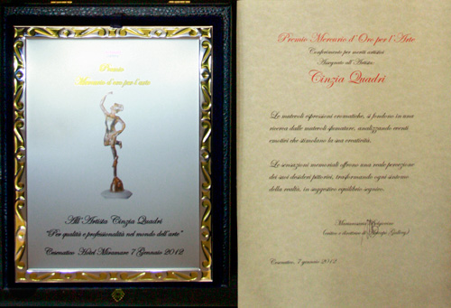 2012 Premio Mercurio d’oro per L’arte – Cesenatico – ricevuto dalla Gallerista/Critico d’arte Maria Rosaria Belgiovine di Artexpo’ Gallery